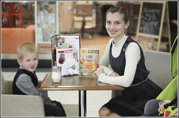 Окончание прогулки решила увенчать походом в кафе - обещала детям мороженое. Пока дошли до ТЦ, младшие уснули. Что ж, устроили с Мишкой романтИк на двоих. Он - мужчина. Маленький ещё, но мужчина. Позволила расплатиться за нас с ним: предварительно дала денюжку в кармашек и спросила, угостит ли он меня. Гордый сидел, как индюк:-) Спинка прямо, подбородок кверху, губки поджаты. Выпердрюююююшка.