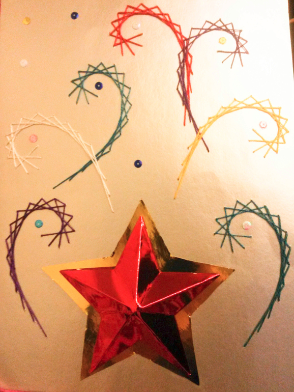 А еще никак вышивки её разные не покажу. Вот последняя, в технике изонить. Салют героям! К 9 мая отнесла в сад.