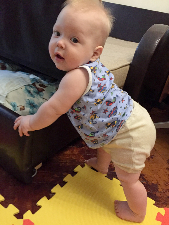 Уверена, что если бы была кроватка, он встал бы еще раньше. А пока прелесть имеющейся шведской стенки не раскусил :)