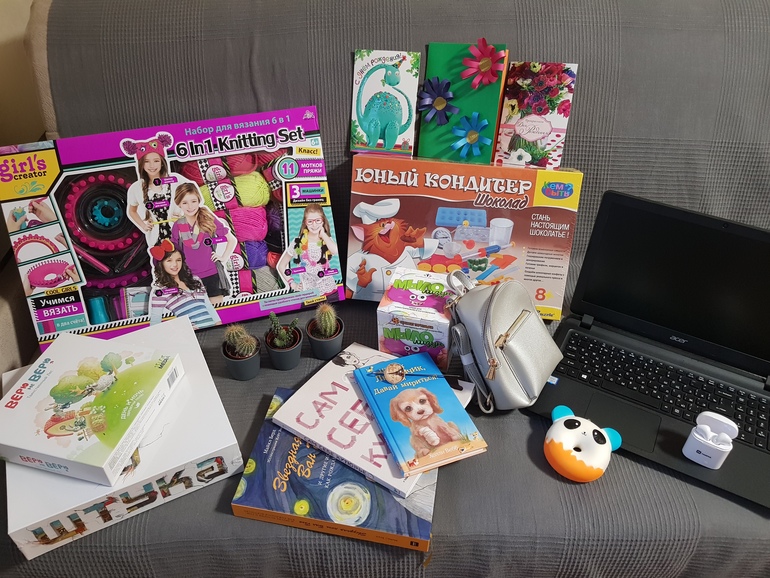 От друзей гора подарков. И потрясающие книги, и настольные игры, и набор шоколатье, станок для вязания, беспроводные наушники и стильные девочковые штучки.