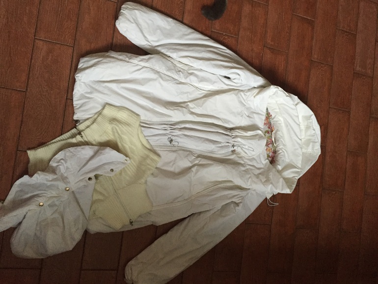 Состояние идеальное. В комплекте капюшончик непромокаемый для малыша и короткая (только грудь прикрывает) кофточка с горлом для мамы. Слинговставка отстегивается, можно носить как обычный плащ. Есть прорези-кармашки, чтобы малыш вытащил ручки или чтобы мама могла иметь к нему быстрый доступ.