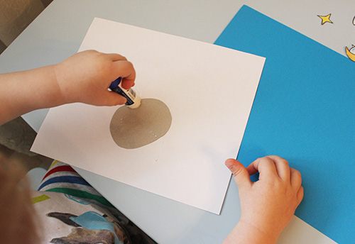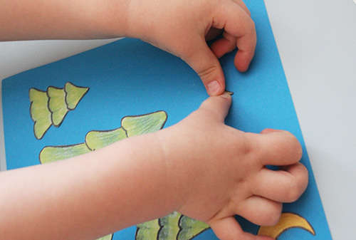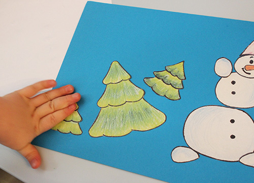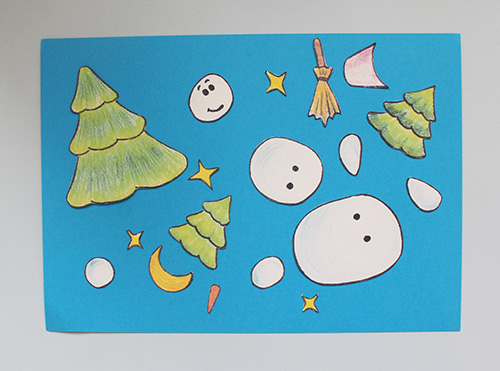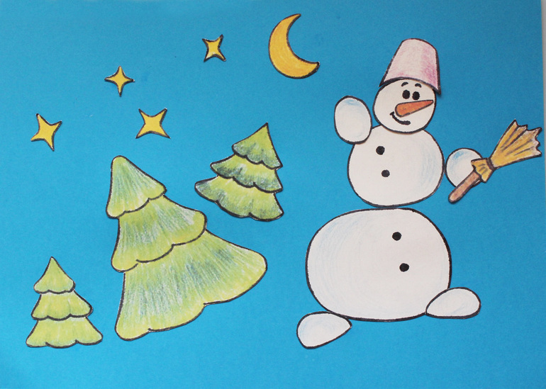 Честно сказать, шаблон очень удачный, много деталек для приклеивания, причем все детальки такие "универсальные", что куда бы ребенок их не приклеил, все-равно получится удачный финал (мы, например, второй ком приклеили верх ногами, но это же вы не заметили?))) Приклеиные ёлочки-это тоже полет фантазии, а еще звезды и луна.