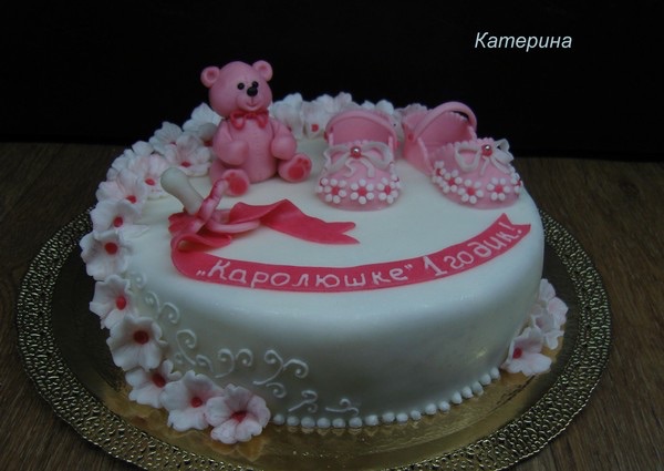 В 11 месяцев рост 73 см (странно, дома я на меряла 76) и вес 11 кг. К годику заказала вот такой тортик, только с надписью Мирославе 1 годик! :