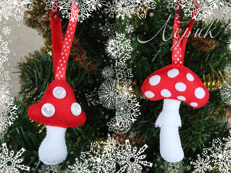 Мне очень нравится как смотрятся красно-белые мухоморчики на зеленой елке