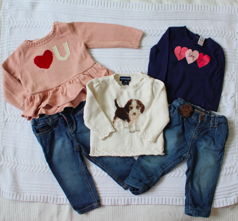 Свитер розовый Gap 600 руб 12-18, джинсы под ним 300 руб, свитер Ральф с собакой 12 мес 600 руб, Синий топ 6-9 Zara 100 руб джинсы с подкладкой Zara 400 руб