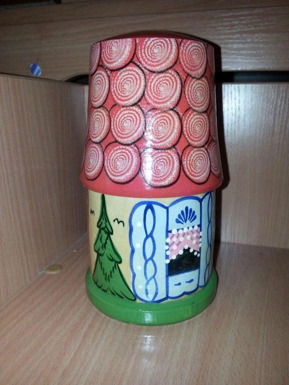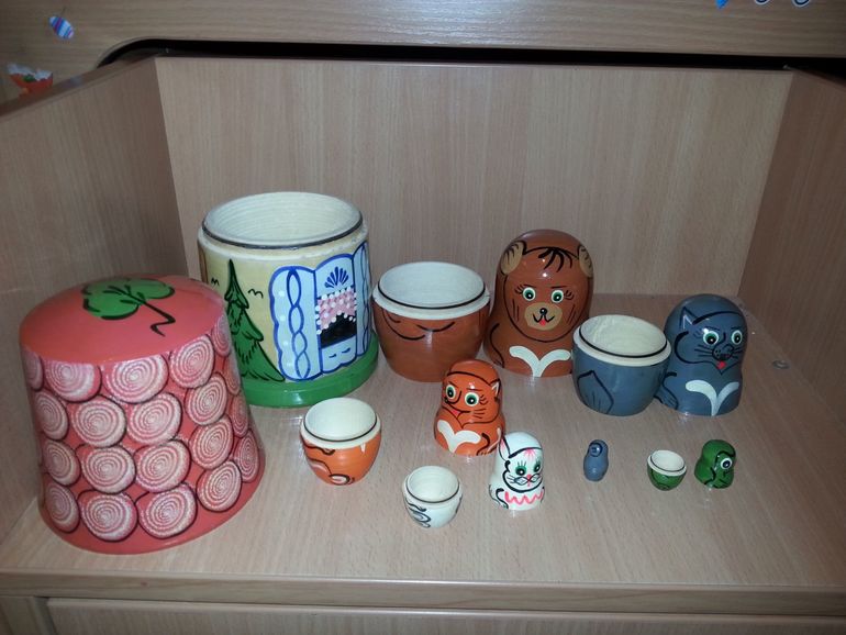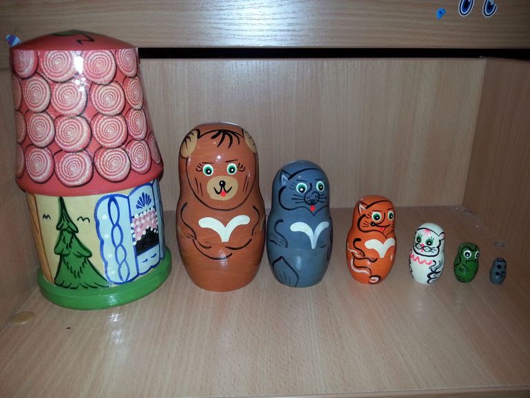 Высота матрешек: теремок - 21 см, медведь - 14 см, волк - 11 см, лиса - 8 см, заяц - 5 см, лягушка - 4 см, мышка - 1 см