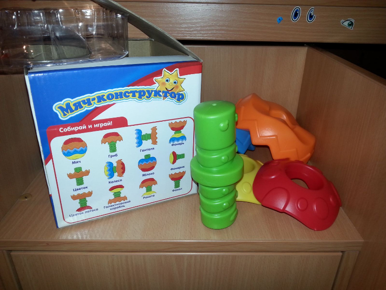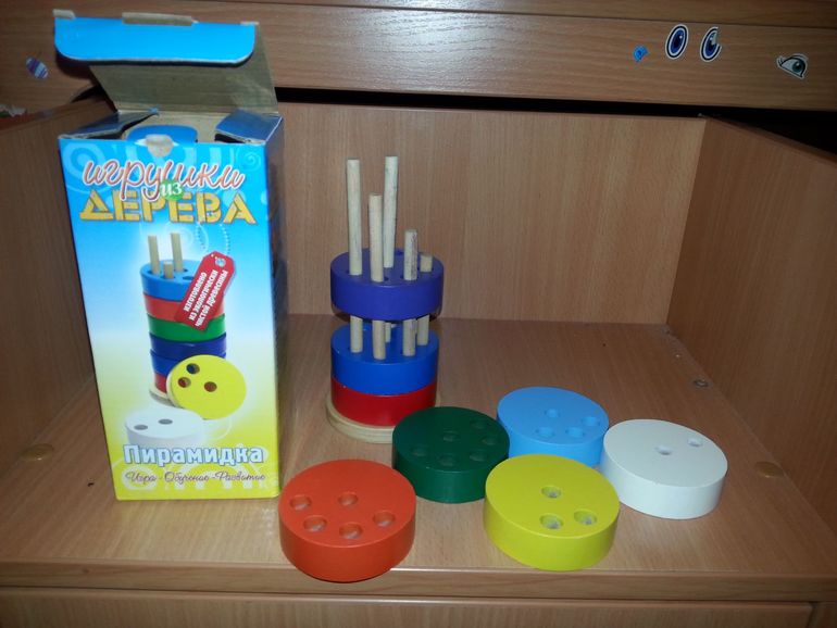 пирамидка эта непростая. Чтобы ее собрать, надо потрудиться. Все дело в том, что пирамидка имеет не одну центральную ось (как в обычной пирамидке), а несколько осей разной высоты. Цветные кружочки имеют по несколько дырочек. Собирая пирамидку, надо все время соотносить количество дырочек на кружочках с количеством оставшихся осей.