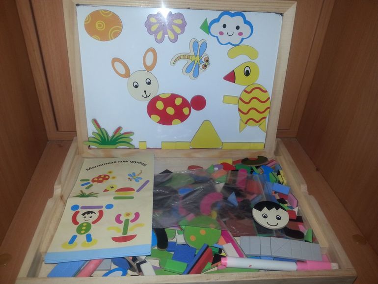 Отличная игрушка для малыша. Способствует развитию мелкой моторики, логического мышления, координации движений. В конструктор входят: 70 деталей, 1 спонжик, 1 кисть, 2 мелка