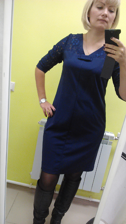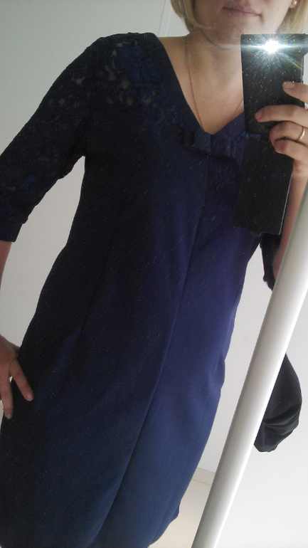 Платье темно-синее. Модель "Шанель" с гипюровым верхом. Очень стильная офисная модель. Размер 52,54 . Маломерит на размер.