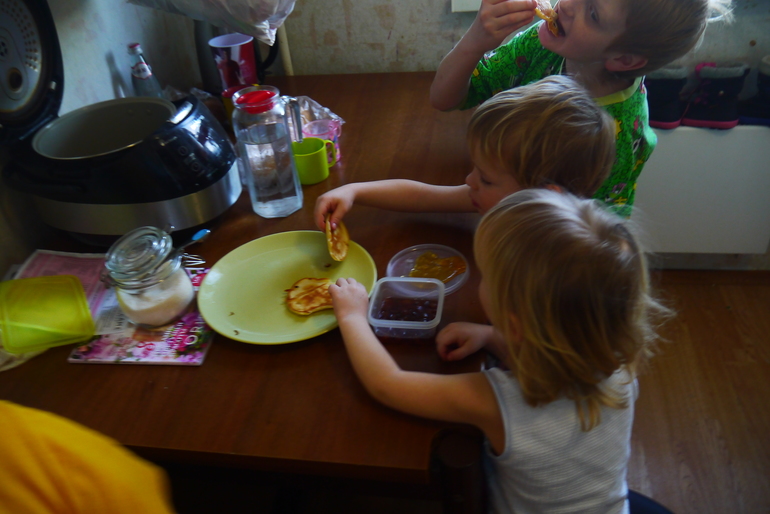 Сами съели с земляничным вареньем (ягоды сами летом собирали) и медом. Ну и с братом поделились.