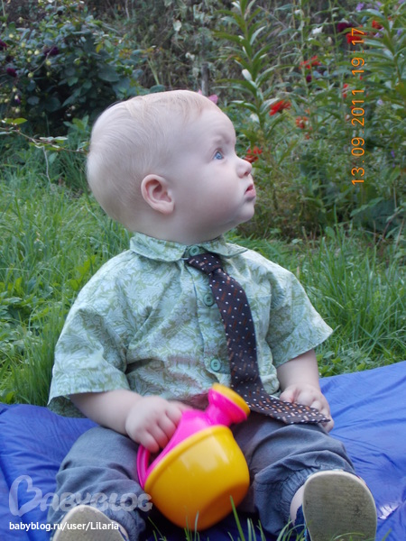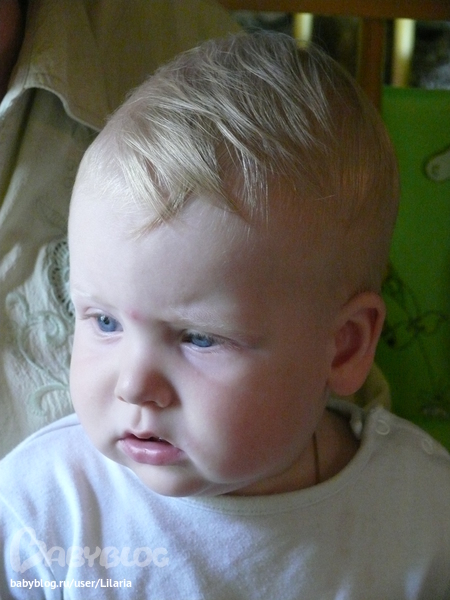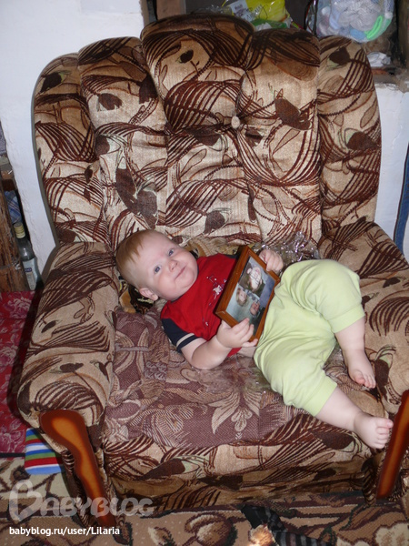 Любит фотографии=) Эта его любимая-для утешений...вот грохнулся за минуту до того ка ксделанно фото....а тут уже мило улыбается=) Показывает пальчиком на фото кто где...=)