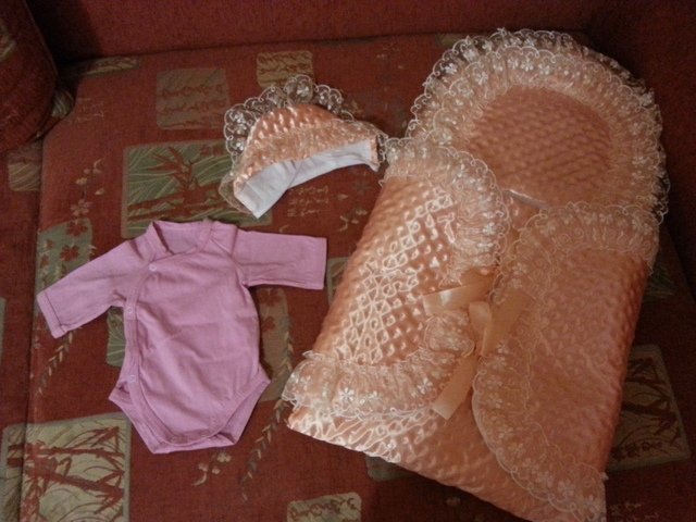 В таком конверте планируем выписываться, еще прилагаются пеленки и белый чепчик нарядный. Ну думаю если будет жарко одену под него только боди) Сама не очень люблю рюши,но для девочки по моему хорошо)
