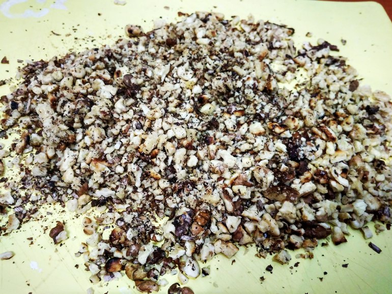 Для начала подготовим орехи: очищаем. обжариваем на сухой сковороде либо подсушиваем в духовке. Остужаем. Затем измельчаем при помощи скалки.
