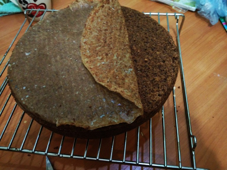 Готовый корж вынимаем из формы, кладем на решетку, снимаем пергамент. Оставляем до полного остывания.