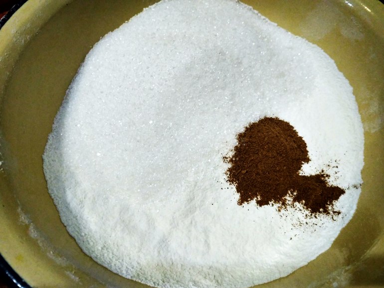 Смешиваем сухие ингредиенты: муку, корицу, соль и сахар.