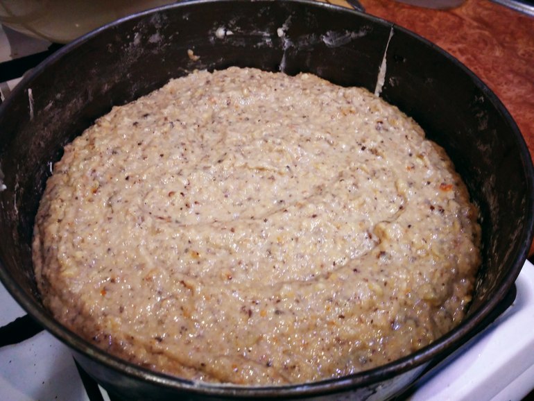 Выливаем тесто в форму и отправляем в разогретую до 220 градусов духовку на 1 час (готовность проверяем деревянной шпажкой).