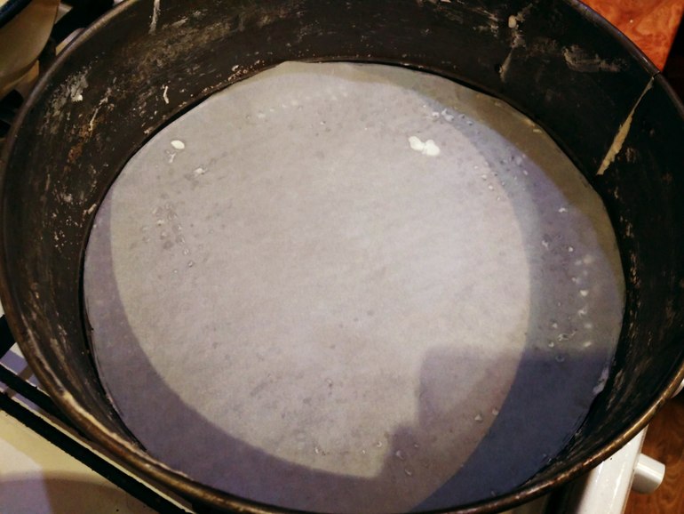 Подготовленную форму смазываем по бокам маргарином. на дно кладем пергамент, вырезанный по дну. Это позволит без проблем достать из форм готовый пирог.