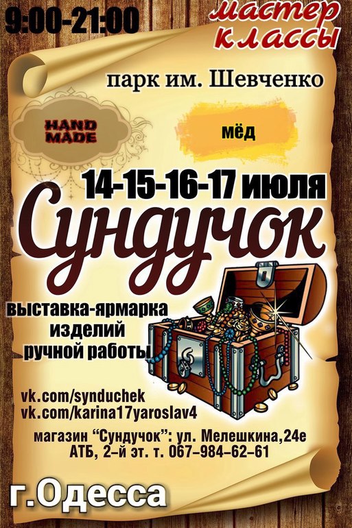 Приглашаю всех на выставку-ярмарку, которая будет проходить 14-15-16-17 июля в парке им.Шевченко (центральная аллея) г.Одессы! Будет много интересного!