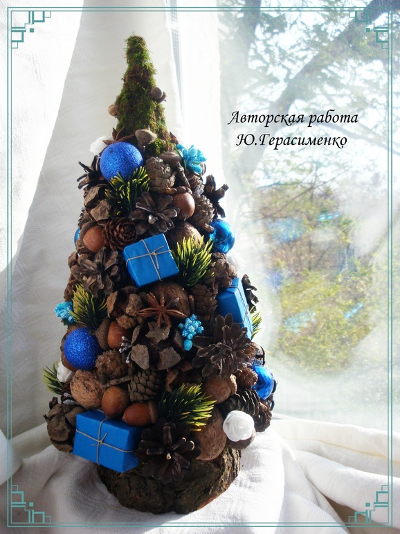 Использованные материалы: мох, шишки сосны, кипариса и лиственницы, скорлупа ореха, желуди красного дуба, звездочки ароматного бадьяна, а так же декоративные элементы. Основа - деревянный спил. Высота красотки 35 см.