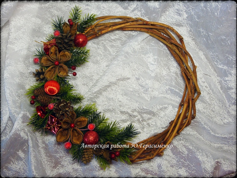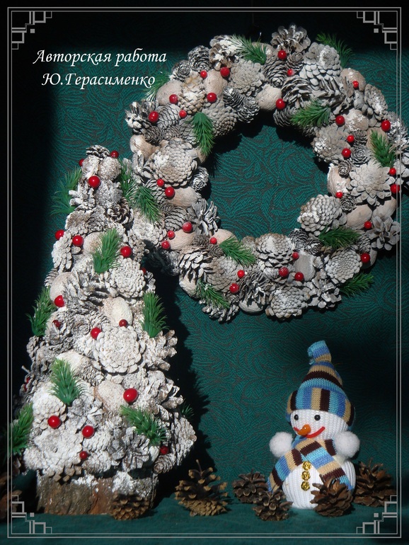Высота ёлочки 35 см, диаметр венка 33 см. Выполнены из шишек сосен разных пород и шишек лиственницы, декорированы искусственными ягодами и хвоей. В основании елочки деревянный спил. И венок и елочка тонированы искусственным снегом. Обе работы в наличии. Продаются как в комплекте, так и порознь.