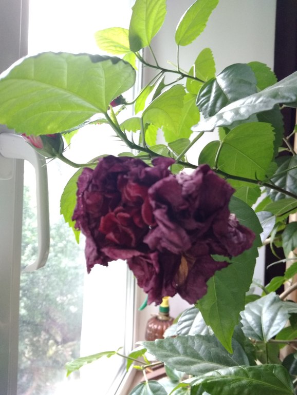 Здравствуйте! За 8 лет выращивания гибискуса впервые сталкиваюсь с таким: отцвевший цветок не отвалился как обычно, а остался на растении. Я думала, что это созревают семена. А сегодня муж заметил, что внутри вновь появился новый цветок!