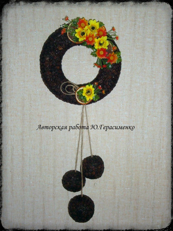 Все как-то не доходят руки разместить работы. Накопилось очень много, но покажу парочку. Итак, хит сезона - комбинирование искусственных цветов с зернами кофе. Интерьерная композиция "Подсолнухи"
