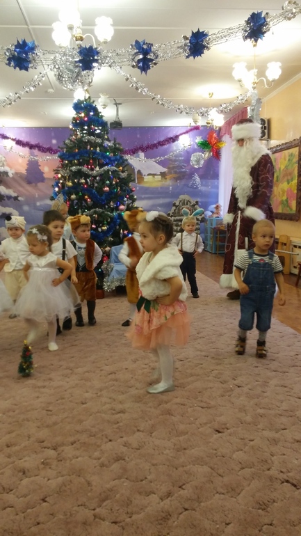 Мне моказалось, что программа для таких малышей очень объемная и долгая!Вышло примерно на 30-35 минут. И хороводы водили, и танцы танцевали, и с Дедом Морозом играли, отгадывали загадки. Сам Дед Мороз, конечно, разочаровал( какой-то безэмоциональный совсем! Детки, конечно, все равно были заинтересованы. Но нам не очень понравился, так монотонно разговаривал( у Илюшки бы в сто раз лучше бы получилось!)))