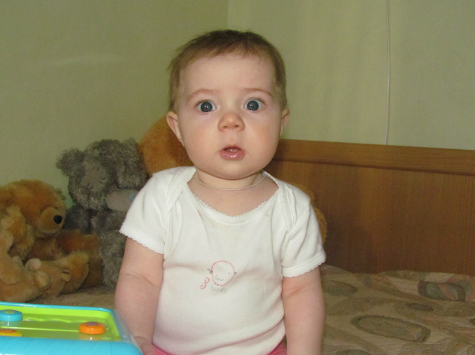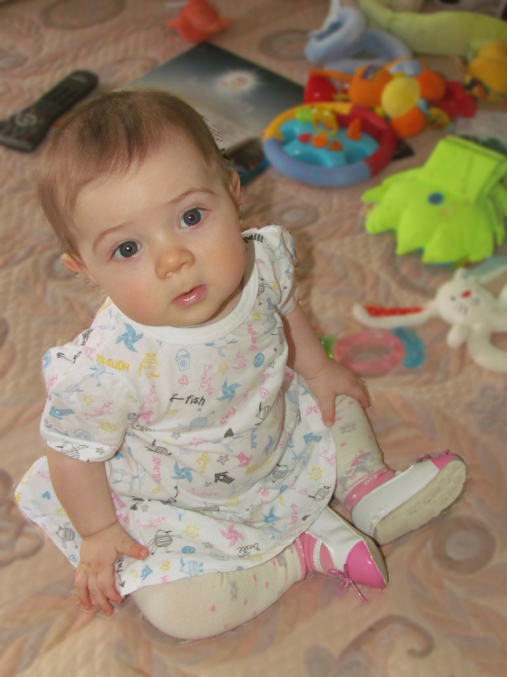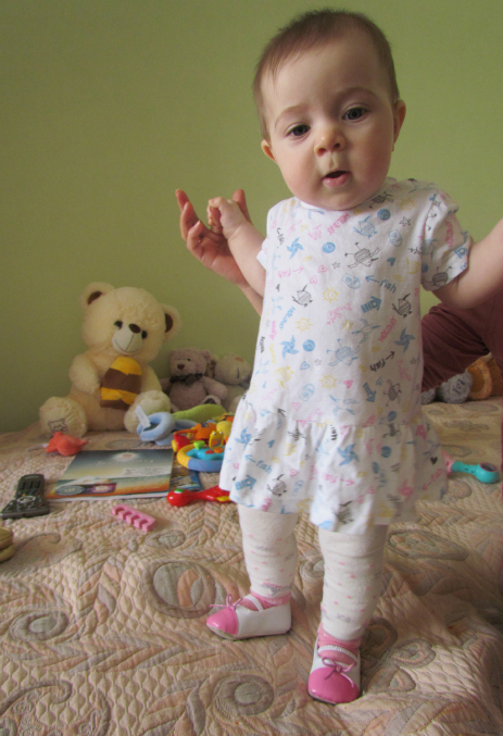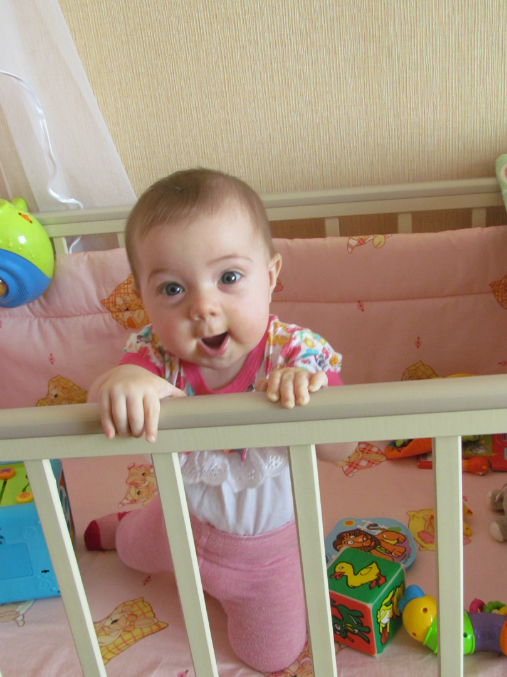 ...Уже недели две-три назад Анюта стала стараться вставать. Но получалось только на коленочки, а дальше ножка соскользывала вперед и проваливалась между дощечками кроватки. Просто за ручки встает без трудностей) И вскарабкиваясь по маме тоже легко. А вот в кроватке никак не получалось! и так расстраивалась, начинала плакать. Вот наши попытки!)