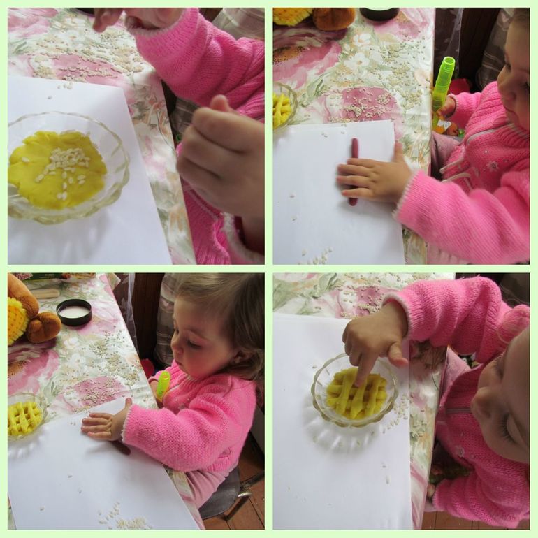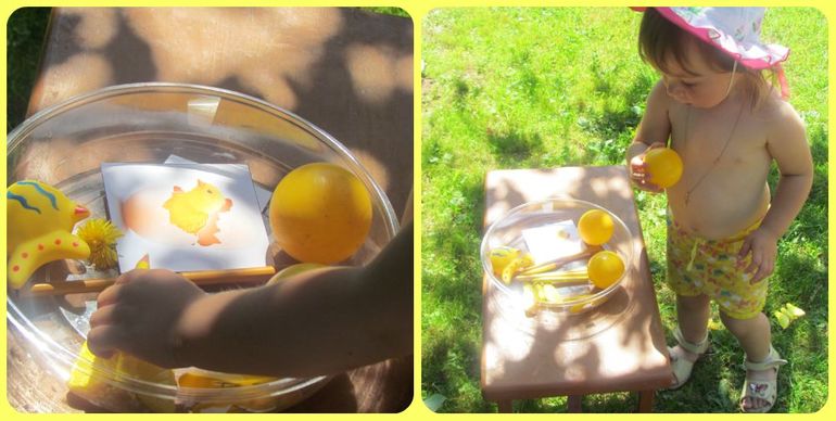 Сегодняшний день, посвященный этому яркому летнему цвету, мы начали снова с коробочки желтых предметов. Среди всего были прищепки, я показала, как они работают, думала, что Анюта заинтересуется. Но нет( посмотрела, как я их креплю и стала остальное трогать.
