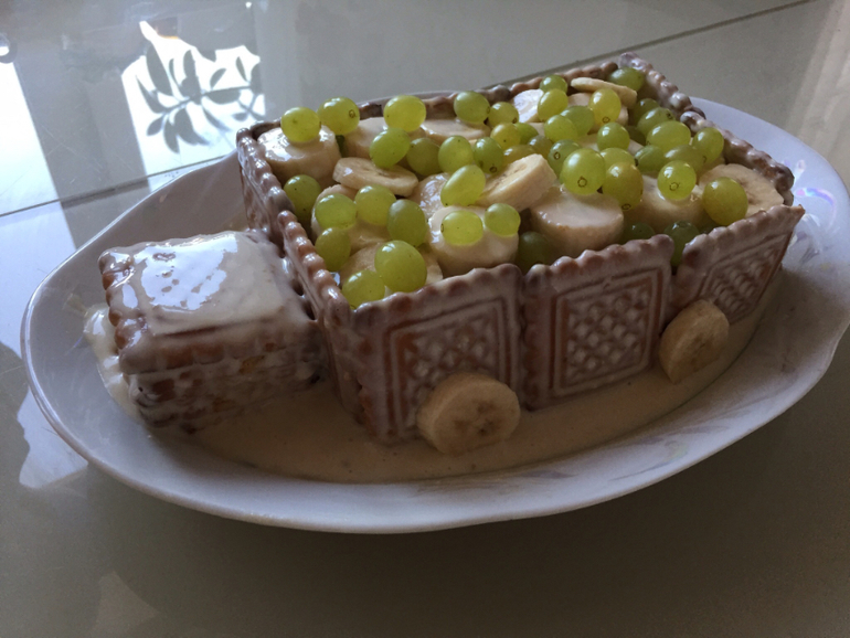Приготовление совершенно несложное, но очень увлекательное для детей. Обмазывать/окунать печенье в крем и выкладывать в нужную форму. У нас мужской десерт вышел - машина. Похоже ведь, правда?) Мы старались)