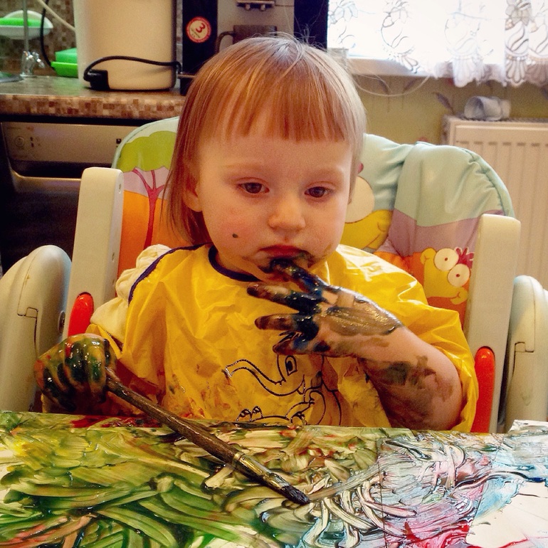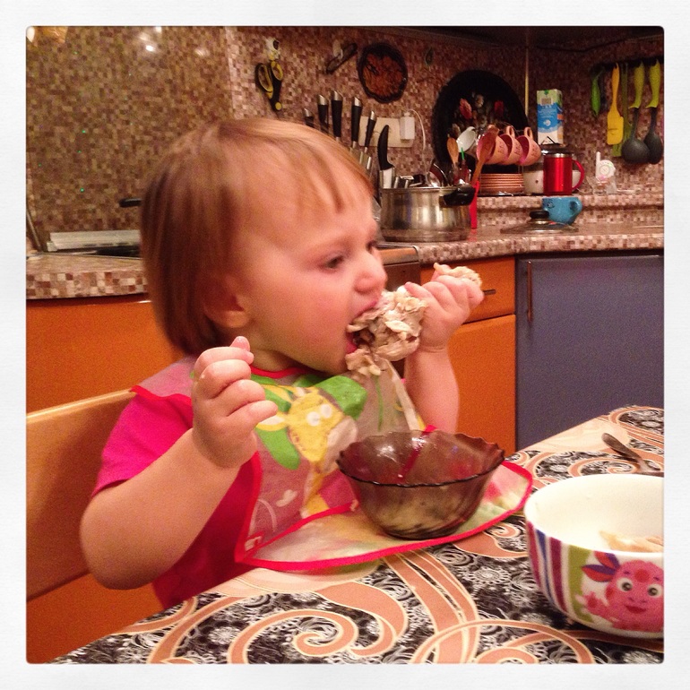 Шустрая вояка, Руське ни в чем не хочет уступать, тянется за ним.. Купили Руслану стул взрослый, очень удобный, с подножкой, так она тоже затребовала, Руслана начала спихивать, пошли драки за этот стул.. Так и пришлось нам заказывать и для нее такой же.., теперь, как взрослая, сидит с нами за общим столом)))
