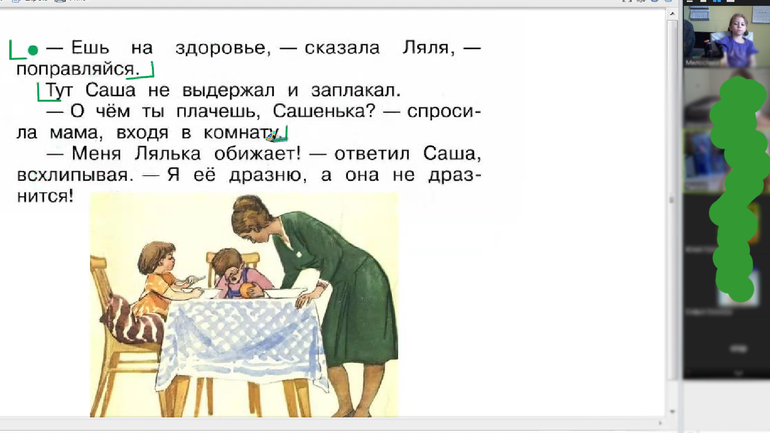 А у 7-леток всё тихо, спокойно. Если Егор обиделся, что Маша прочитала его часть диалога, то он выключает камеру и звук и идёт плакать. Т.е. никому не мешает. И минуты через 2 возвращается.
