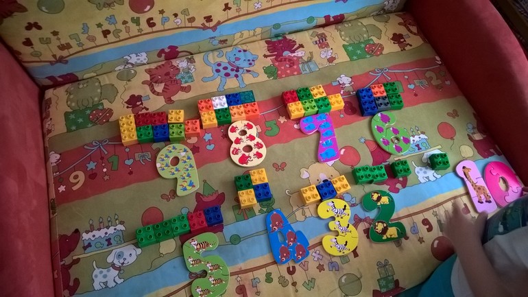Пы.сы. на 9-ке уже немного сбился, я показала что надо заново пересчитать и добавить одну недостающую детальку. В углу уже хотел 10 составить. Самое главное это собственная его идея, не из какого мультика. Может уже показать сложение и вычитание, или сам додумается...