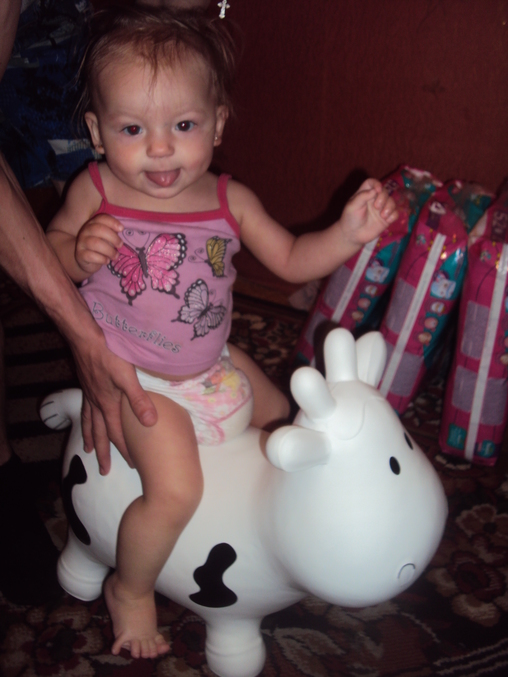 офигеть время летит=)))) что умеем......ммммм........ходим хорошо,давно и не падаем=) 2 зуба нижних имеем и те недавно вылезли=))))) немного говорим=) кушаем, тщательно своими 2 зубьями, пережевывая пищу=) активный,подвижный ребенок!!!! из игруше пожалуй самая любимая это фитоКОРОВА=))))))))) супер супер штука,скачет как на пони=) ну и фоточка не оч хорошего качества,но прикольная=)