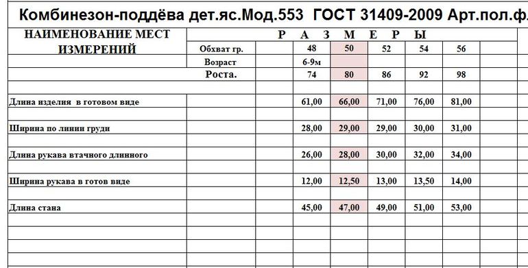 Линейные замеры комбинезонов