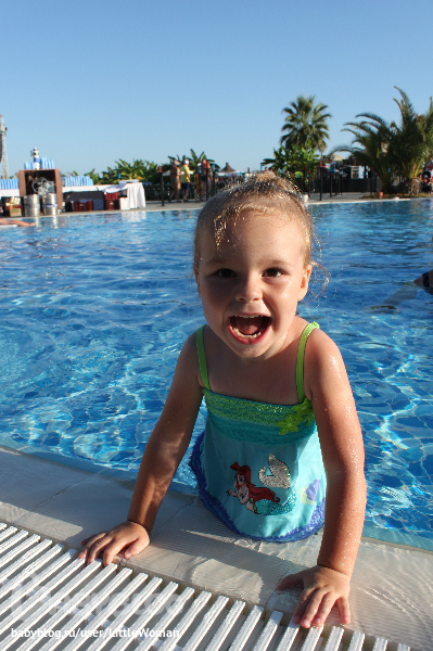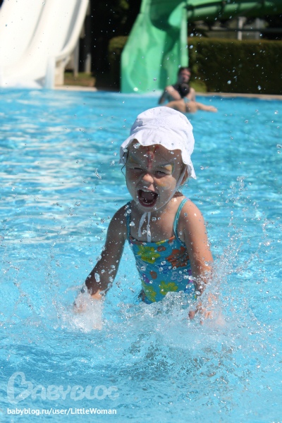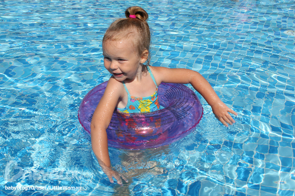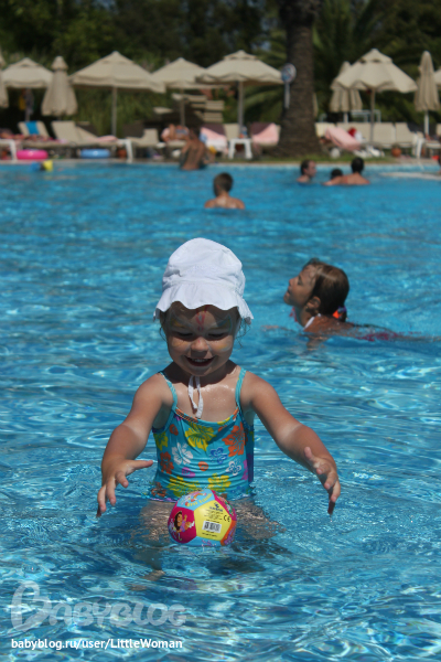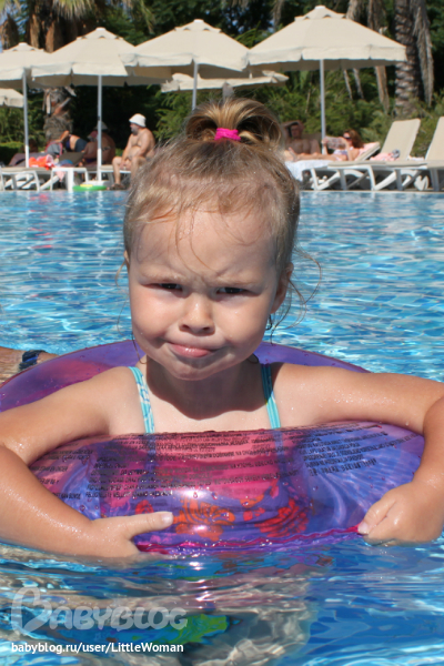 Ребёнок у меня не водный, если можно так выразиться... по крайней мере, пока. Первые дни Вика просто-напросто боялась воды. Ни на шаг не отходила даже на мелкоте, хваталась за меня.. Плавали мы с ней с кругом и у меня на горбе =)) Потом удалось её как-то шутками-прибаутками растормошить...