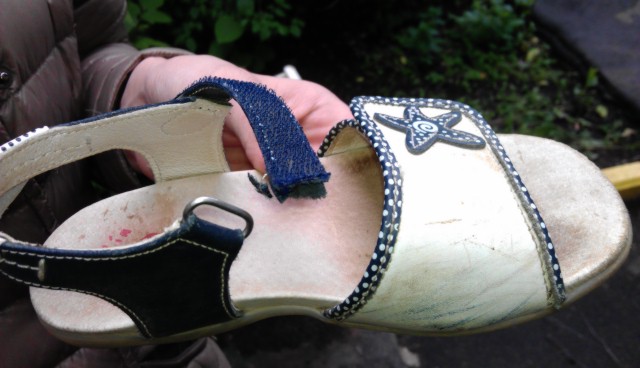 Прошлым летом босоножки были нам велики. И вот достаю я их в конце апреля, для сада. Походили мы в них неделю в саду, а потом, уже после праздников 3 дня!!! НЕДЕЛЮ В САДУ В ГРУППЕ И 3 ДНЯ НА УЛИЦЕ!!!!!!!!!!!!!!!!!!!!!!!!!!!!!!!!!!!! в саду на прогулке и ВСЕ!!! у босоножек оторвалась застежка! Честно говоря, покупая такую марку, думала, что обувь качественная, но ошиблась. Хотела приклеить, но там просто даже клеять бесполезно, так как в любом месте она потом опять оторвется. Это даже не кожа, а дермантин какой-то...