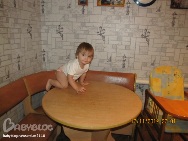 А еще Маруся сама залазит на свой стульчик. Если он стоит на кухне, то с обеденного диванчика, а если стоит в комнате, то с пола. Одна из последних фишек - залезть на стол где мы кушаем.
