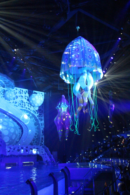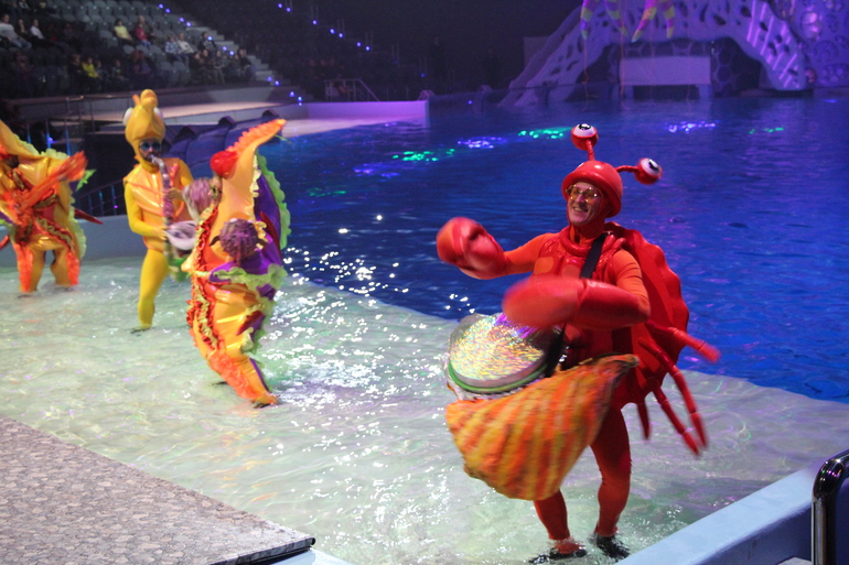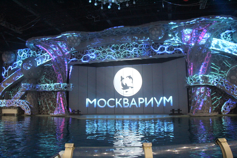 Круглый бассейн, амфитеатр для зрителей, сцена, шикарная работа с проекторами, светом, три выката для животных и дрессировщиков рядом со зрителями, плюс воздушные гимнасты, акробаты, огромные надувные декорации.