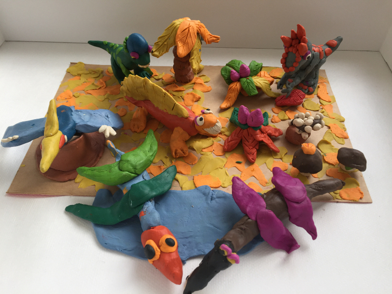 Дети сели лепить, потом захотели слепить динозавров и ящеров (они же знают что диметродон, птеродактиль, криптоклид и какой-то еще водоплавающий... это не динозавры). Живности стало получаться три, потом захотелось сотворить еще и возникла идея сделать им полянку. На дворе осень? - осень. Юрский период притянули за уши для красивого названия:)