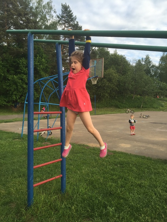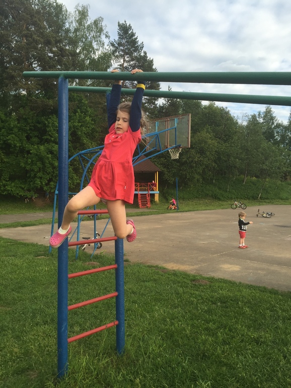 Дети начали много лазить по снарядам, особенно Саша и Олежка, в прошлом году они были более аккуратными. Я как параноик всегда их страхую, не могу быть в стороне когда они куда-то лезут на высоту в 2-3 раза выше их собственного роста. Иногда они радостно прыгают в мои объятья:) надеюсь моя спина выдержит это лето:)