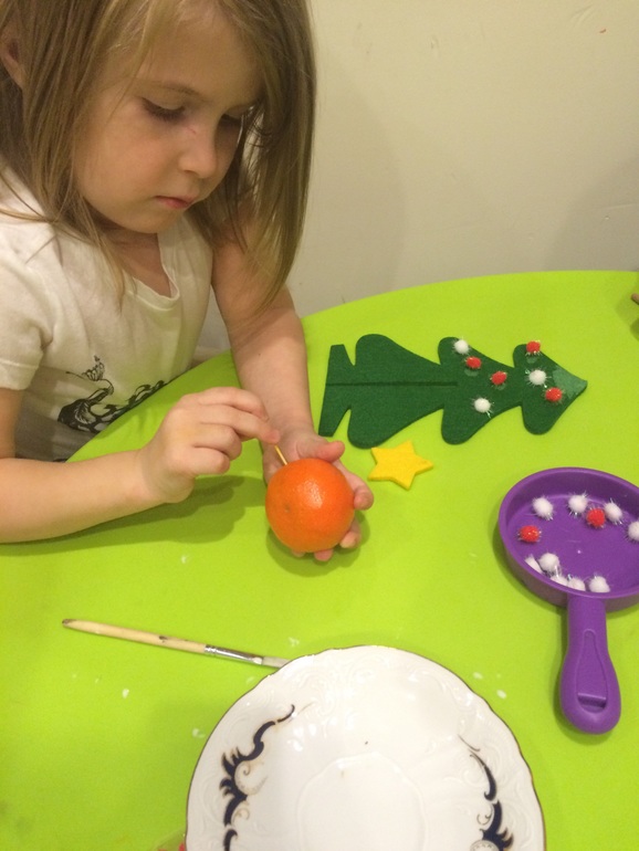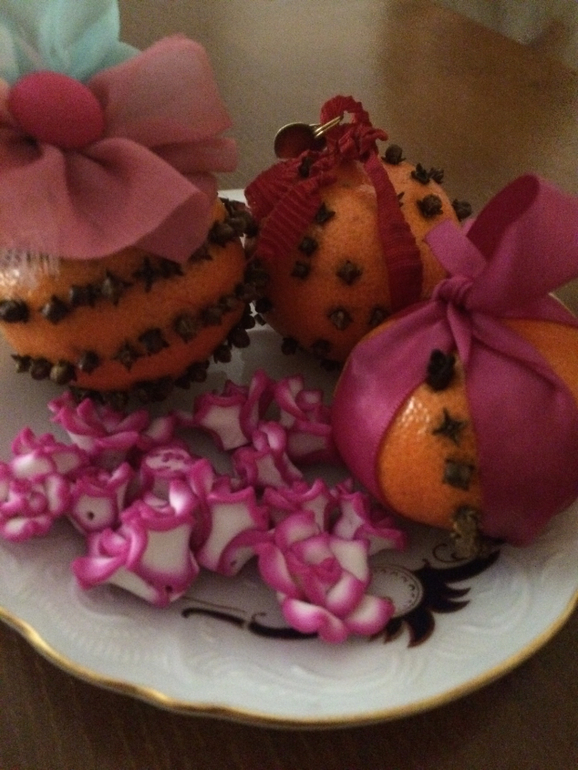 повесили гирлянду на кухне:) сегодня занялись ароматным делом, которое я планировала на декабрь, но решила сегодня порадовать своих болеющих чем-нибудь новеньким, к тому же папа принес мандарины. Сделали мандариновых ежиков (помандер):) ленточек в доме не оказалось, Саша из своих шкатулочек достала заколки, подвязочки с кулончиками и получились украшения.