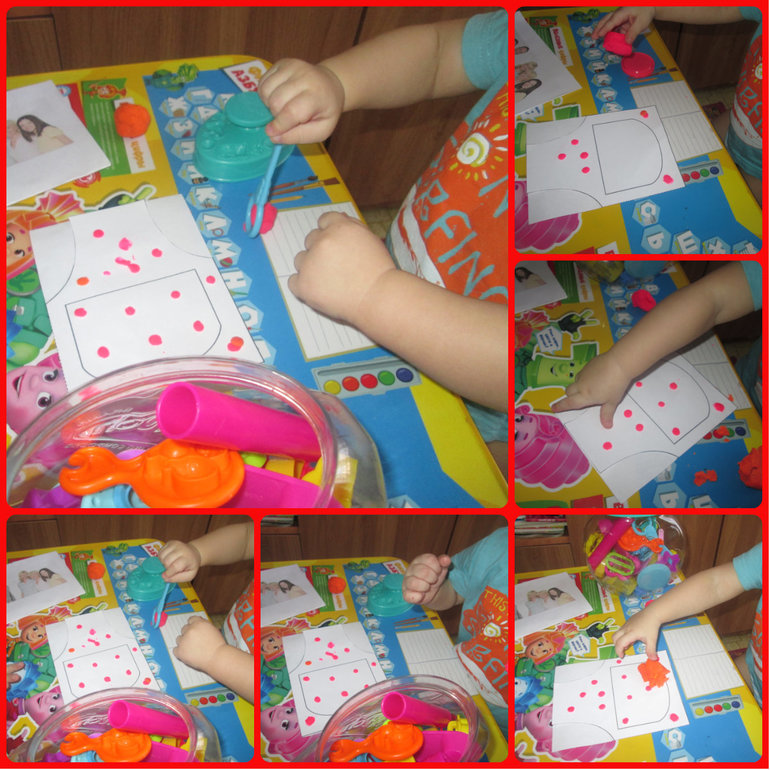 Задание с клубком ниток мы пропустили. А вот открытку-фартук сделали на "пятёрку". Правда я немного изменила задание, заменив краски на любимый пластилин. Делали мы фартук в горошек: