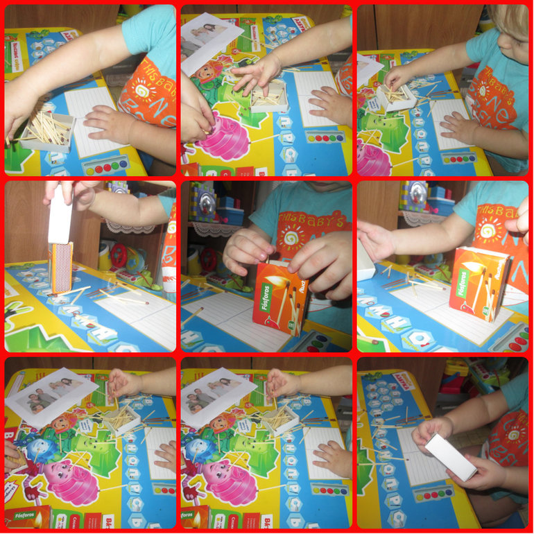 Помогли деду собрать рассыпавшие дрова-спички. Сыну понравилось! Собирал и пригоршней и поштучно. Ставил детали коробка друг на друга, складывал "дрова" в вертикально поставленную крышку. Собирал и разбрасывал, собирал и разбрасывал...