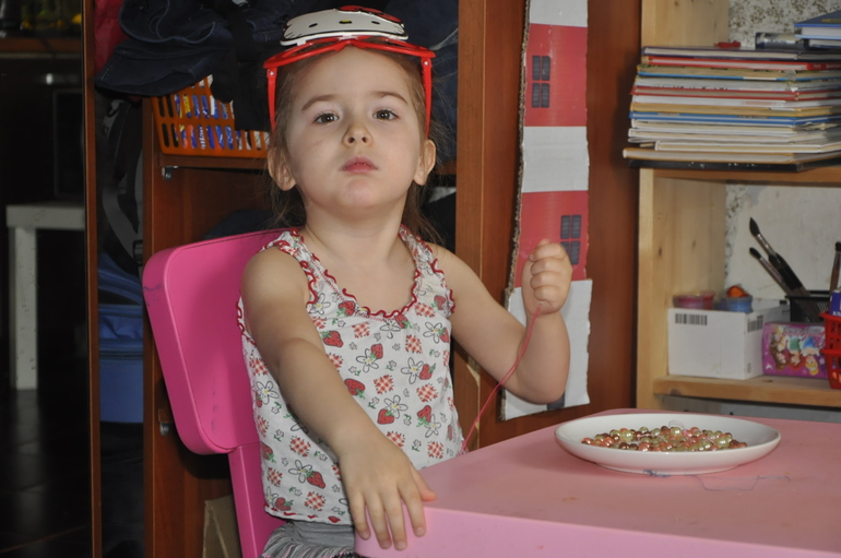 Вика: Развитие речиПопыталась совместить приятное с полезным, дала Вике нитку и бусы и попросила в определённом порядке (задание на логику) нанизывать бусы. Вика в ответ: