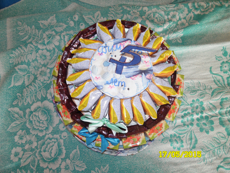 В садик принято приносить "могорыч", так мама в этот раз скреативили и сделала "торт" из сладостей