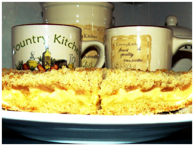 Застилаем форму пергаментом, смазываем сл.маслом и насыпаем первый слой нашего пирога (ровно половину песочной крошки), далее второй слой-выливаем сверху на крошку творожную начинку, третий слой-выкладываем нарезанные дольками бананы (вместо бананов, можно взять яблоки) и наконец четвертый (последний) слой- вторая половина песочной крошки.