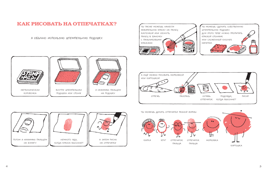Для любителей штамповать пальчиками незаменимой будет эта книга. Мне бы и в голову не пришло, во что можно превратить обычный отпечаток пальца. Наверное, потому что суровые родители эксперты-криминалисты видели в нем только преступные элементы ))) так то в моем детстве такого вида рисования существовать просто не могло ))