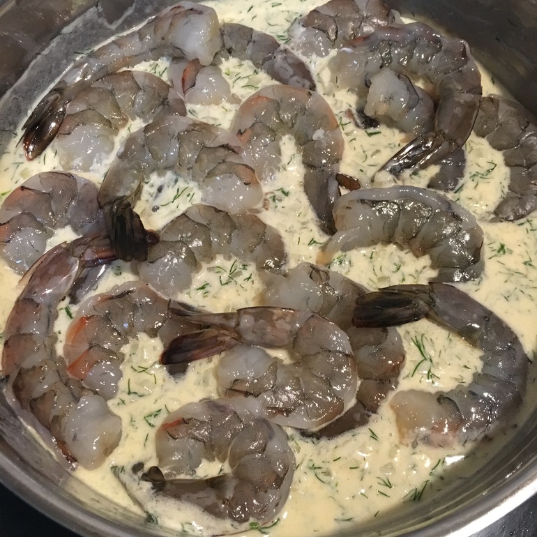 Размешать. И добавить креветки. С каждой стороны пусть проварятся до розового цвета, дольше не нужно (по 2 минуты хватит)