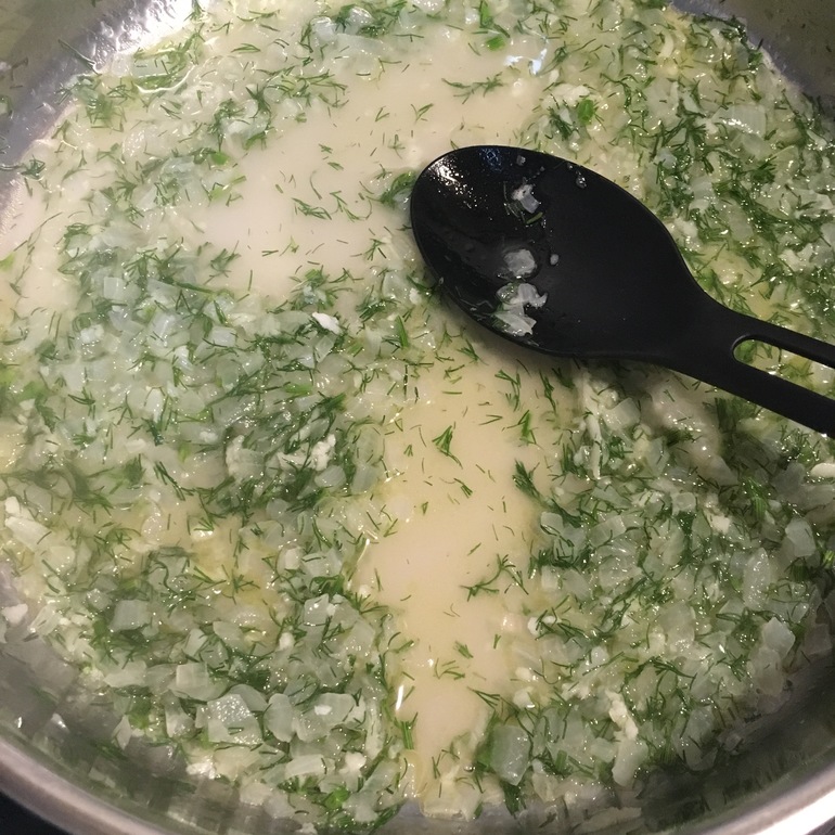 Нагреть оливковое, распустит в нем сливочное масло. Обжарить лук до прозрачности. Добавит чеснок. Прогреть. Забросить укроп.